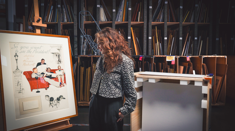 Born of his 1943 visit to the White House, where he observed and sketched the steady procession of visitors seeking an audience with Franklin D. Roosevelt, Norman Rockwell’s So You Want to See the President! is the artist’s only known suite of four interrelated paintings. Here, Heritage’s Aviva Lehmann, Senior Vice President and Director of American Art, admires one of the panels from the series, which was purchased by the White House Historical Association for $7.25 million in a November Heritage auction.
