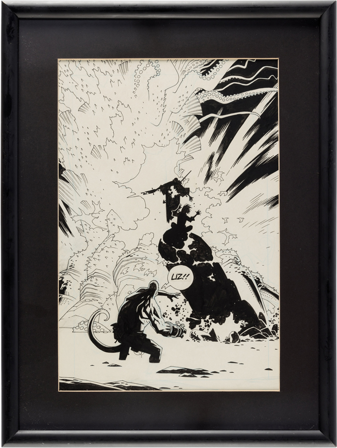 “When I started collecting Hellboy pages, I was determined to get as many ‘firsts’ from the earliest issues as possible. These pages are the rarest to find and belong, impossibly, to the original series ‘Plague of Frogs.’ They involve both John Byrne and Mike Mignola, and this beautiful, exquisite negative-space splash page shows the three main characters, in my opinion – Liz, Hellboy, and the antagonist, Rasputin – and it shows the very first time Liz (the pyrokinetic BPRD member) explodes in the comic book series.”
