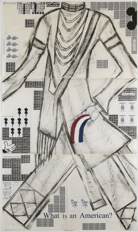 Jaune Quick-to-See Smith, ‘What is an American?,’ 2001-2003. Lithograph, chine collé, monotype. 68 x 40 inches (172.72 x 101.6 cm). Gift of Ofelia Garcia, The Pennsylvania Academy of the Fine Arts.