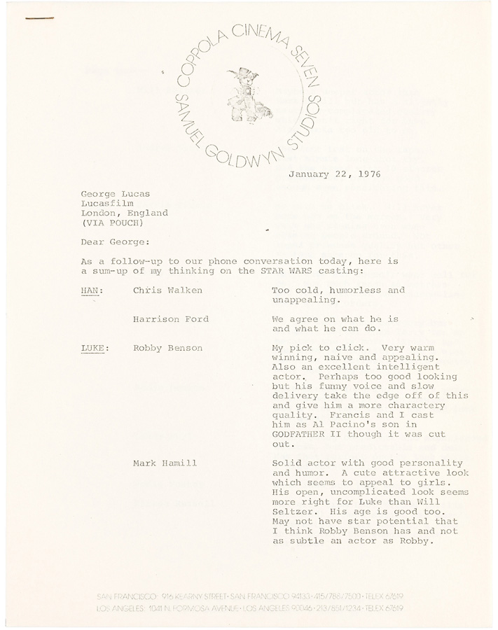 These ‘Star Wars’ casting notes outline Roos’ opinions on actors such as Christopher Walken, Harrison Ford, Robby Benson, and Mark Hamill.