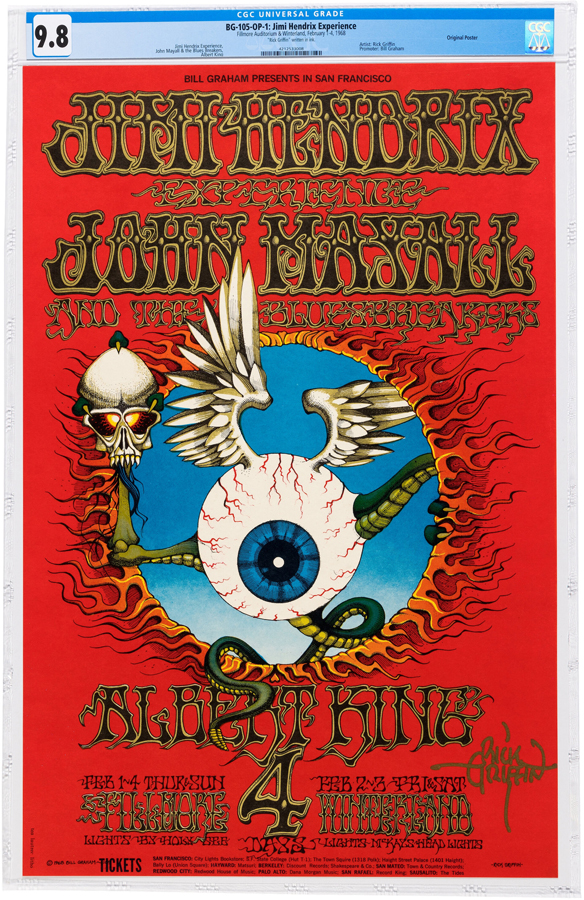 Jimi Hendrix’s 1968 ‘Flying Eyeball’ poster set an auction record for a psychedelic rock poster when it sold for $175,000 in a May 2023 Heritage auction.