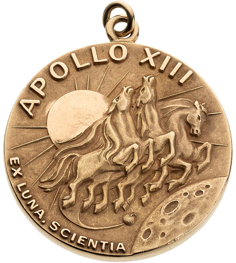 This 14k gold medal is one of only five produced for crewmembers of 1970’s Apollo 13 mission. Due to a last-minute crew change and problems that prohibited Apollo 13 from accomplishing its mission, the original flown medallions were melted down. This is one of five newly designed gold medallions that were struck from the flown metal. The design features the mission insignia depicting the name of the mission, three of Apollo’s chariot horses flying toward the moon, and the slogan “Ex Luna, Scientia” (“From the Moon, Knowledge”).