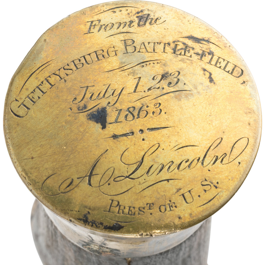 This wooden cane was given to Abraham Lincoln as a gift at some point during his trip to Gettysburg when he gave his Gettysburg Address. Walking sticks were popular gifts at the time, and Lincoln, who did not use one himself, presented it as a souvenir to his Secretary of War, Edwin M. Stanton, who collected canes. Memorializing the importance of the gift’s origin, Stanton added a brass head with the inscription “From the Gettysburg Battle-field, July 1, 2, 3, 1863. / A. Lincoln, Pres’t of U.S.”
