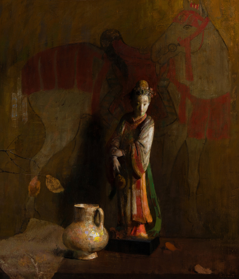 The Armenian-born artist Hovsep Pushman, who settled in New York in 1919, established the standard for Orientalist still-life and figure painting during the 1920s through the 1940s. His paintings, like this circa-1940 work, typically include a wide range of Asian objects glowing duskily, as if illuminated by candlelight. An aficionado of Chinese culture and philosophy, Pushman intended his paintings to function symbolically, and he often paired them with mystical or spiritual readings.