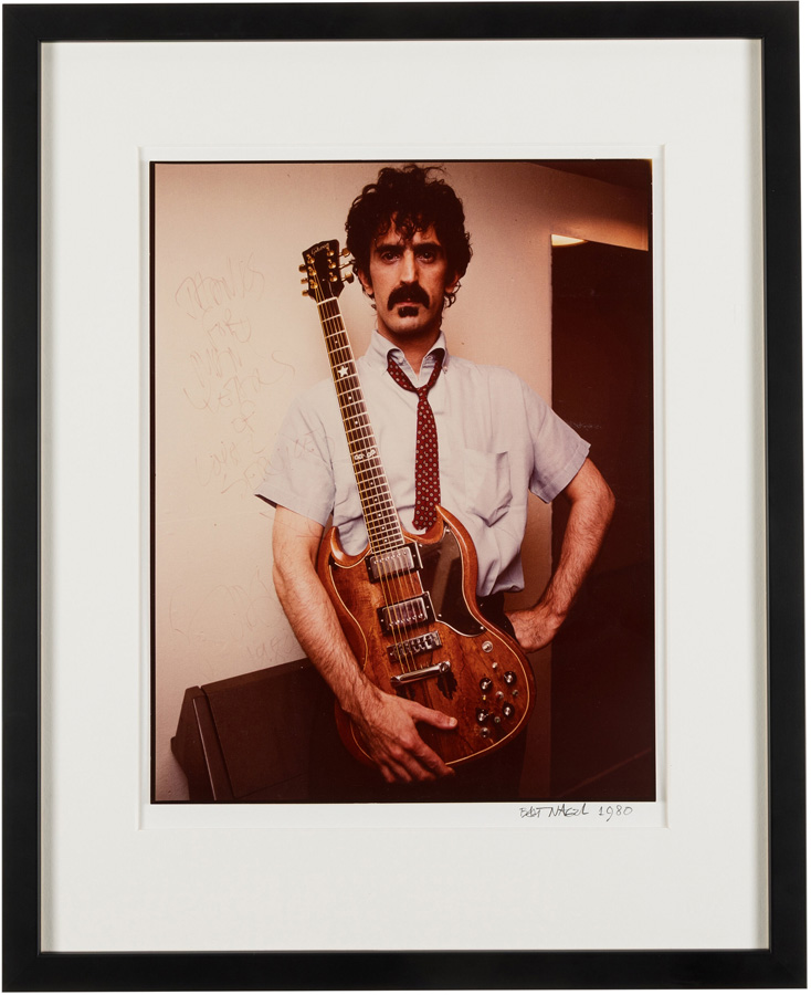 Zappa poses with ‘Baby Snakes’ in this 1980 photograph by Bart Nagel, the Phoenix luthier who built the guitar. The photo is signed and inscribed by Zappa.