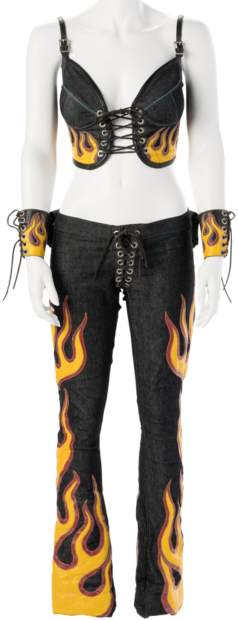When Britney Spears released her second studio album, Oops!…I Did It Again, in the spring of 2000, the poppy title track became a massive commercial success and was nominated for a Grammy Award. That summer, Spears embarked on a concert tour of the same name. During the tour, she donned this denim ensemble adorned with yellow and red leather flames while singing, you guessed it, “Oops!…I Did It Again.” The costume sold for $22,500 in a March 2024 Heritage auction.