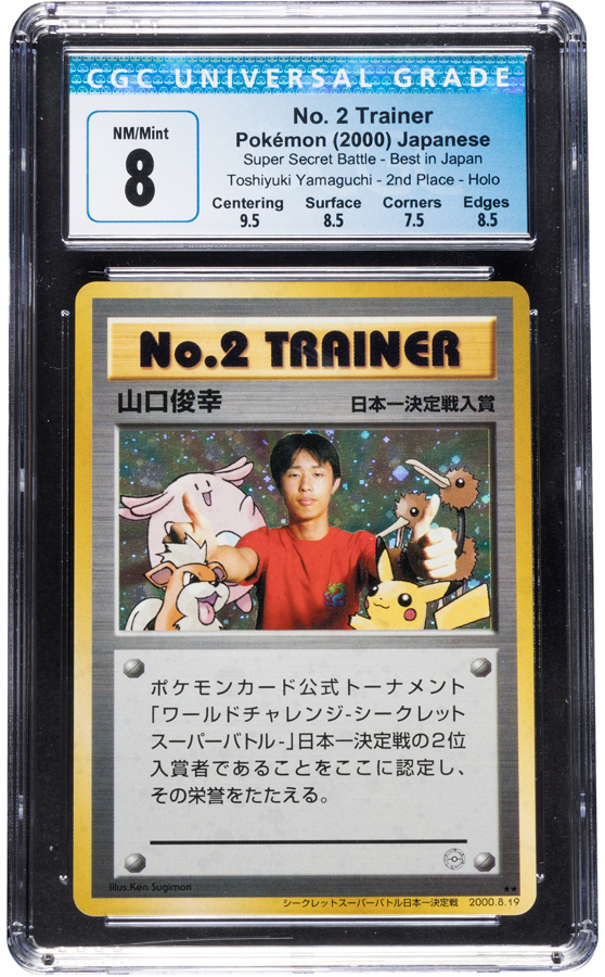 This Pokémon Toshiyuki Yamaguchi No. 2 Trainer card, one of the prizes from a 2000 Japanese tournament, is so rare that many collectors were unaware that it even existed – until Heritage offered the card in a July 2023 auction. The one-of-one card, which sold for $137,500, was one of three prizes created to celebrate the No. 1, 2, and 3 Trainers, complete with pictures of the young winners. This card features the No. 2 Trainer surrounded by Chansey, Growlithe, Dudou, and the franchise mascot Pikachu.