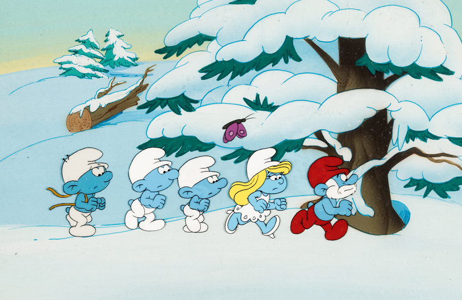 This piece of hand-painted original production art from ‘The Smurfs’ shows Papa Smurf leading Smurfette, Tailor Smurf, and two other Smurfs across a snowy field. Available in Heritage’s February 21-22 Yabba Dabba Doo – The Art of Hanna-Barbera II Animation Art Showcase Auction.
