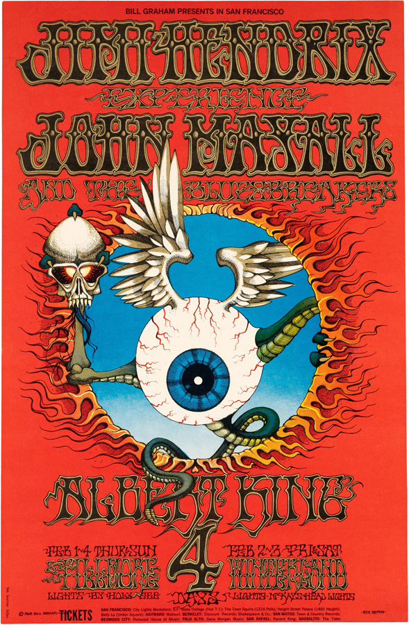 BG-105 Jimi Hendrix Experience 1968 ‘Flying Eyeball’ First-Printing S.F. Concert Poster. Sold for $32,500 in a November 2025 Heritage auction.