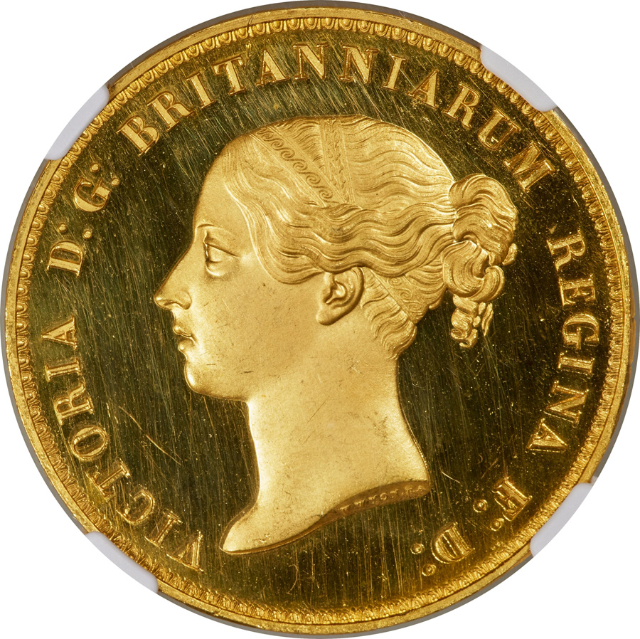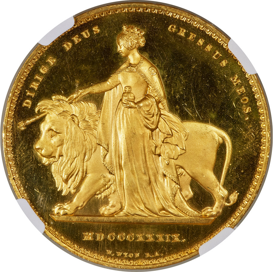 Victoria Gold Proof ‘Una and the Lion’ 5 Pounds 1839 PR62 Ultra Cameo NGC. Sold for $312,000 in a May 2025 Heritage auction.