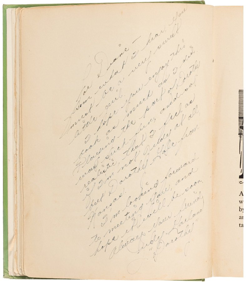 Garland’s lengthy handwritten inscription offers a rare glimpse into the young actress’s identification with her role: “Playing the part of Dorothy was such fun, and so realistic, that I feel as if I’m not Judy at all, but Dorothy Gale from Kansas… .” Presented to Diane Catherine, the daughter of Garland’s private tutor, this signed volume unites the Oz cast in one piece – a poignant counterpoint to the Witch’s imposing hat, embodying both the tenderness and terror that make The Wizard of Oz immortal.