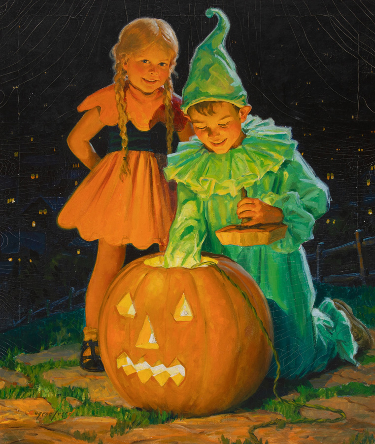 Set against the backdrop of a rural starry night, the grinning kids in Eugene Iverd’s Halloween Smiles are lit from the glow of the jack-o’-lantern they are proudly setting up. The guileless image graced the Halloween 1934 cover of The Saturday Evening Post and stands as one of Iverd’s most delightful depictions of the ideal American childhood, which was his signature subject. The quality, emotion, and nostalgic joy of this work make it a classic example of everything collectors love about cover art from The Saturday Evening Post. The oil-on-canvas painting is available in Heritage’s November 4 Illustration Art Signature® Auction.