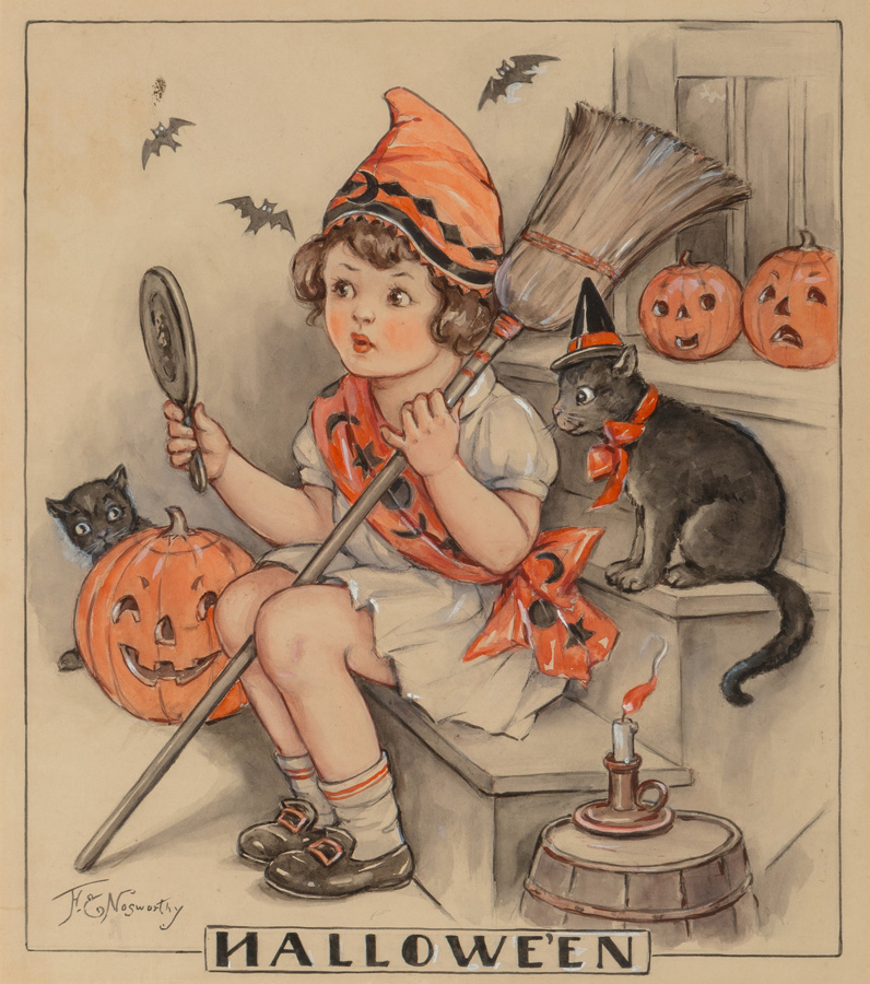 Depictions of kids’ Halloween costumes were a little more wholesome in 1930, as evidenced by this sweet watercolor painting by Florence Pearl England Nosworthy, who created the image for the October cover of Hearth and Home magazine. Here, a rosy-cheeked little girl in an orange sash and witch’s hat admires herself in a handheld mirror while her pet cat, also in costume, looks on. Pumpkins, bats, and a flickering candle round out the charming Halloween scene. The artwork sold for $4,687 in an April 2019 Heritage auction.