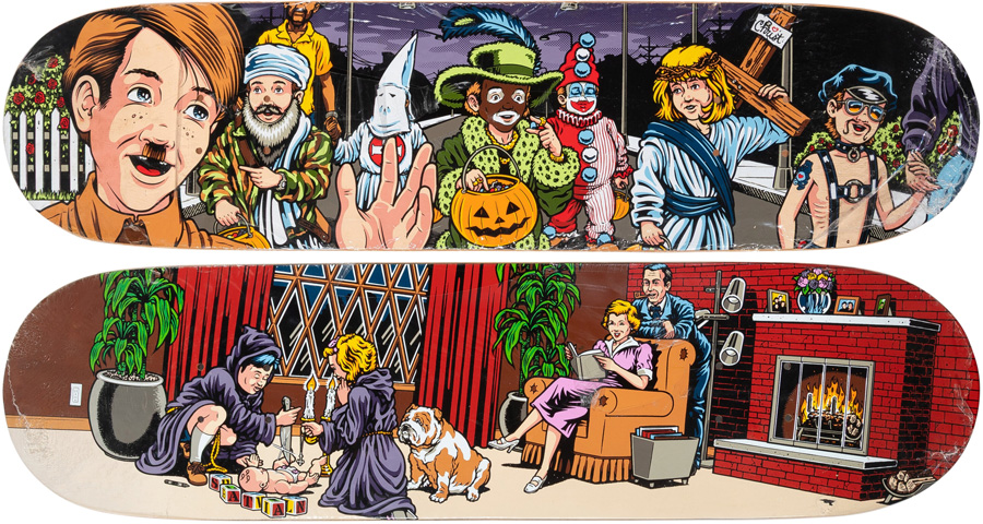 Sean Cliver is a man of many talents. In addition to serving as a producer and writer for the Jackass TV series and movies, he is a longtime skateboard artist who got his start as a designer for Powell-Peralta in 1989. He has even written two books on the topic – Disposable: A History of Skateboard Art and The Disposable Skateboard Bible. In 2008, Cliver, long known for his irreverent and politically incorrect creations, joined forces with the skate brand Supreme, contributing his original artwork to a series of boundary-pushing skateboard decks. The collab included works dubbed Motel Hell and Halloween, the latter a veritable buffet of problematic costumes. Both decks are available in Heritage’s October 30 Urban Art Signature® Auction.